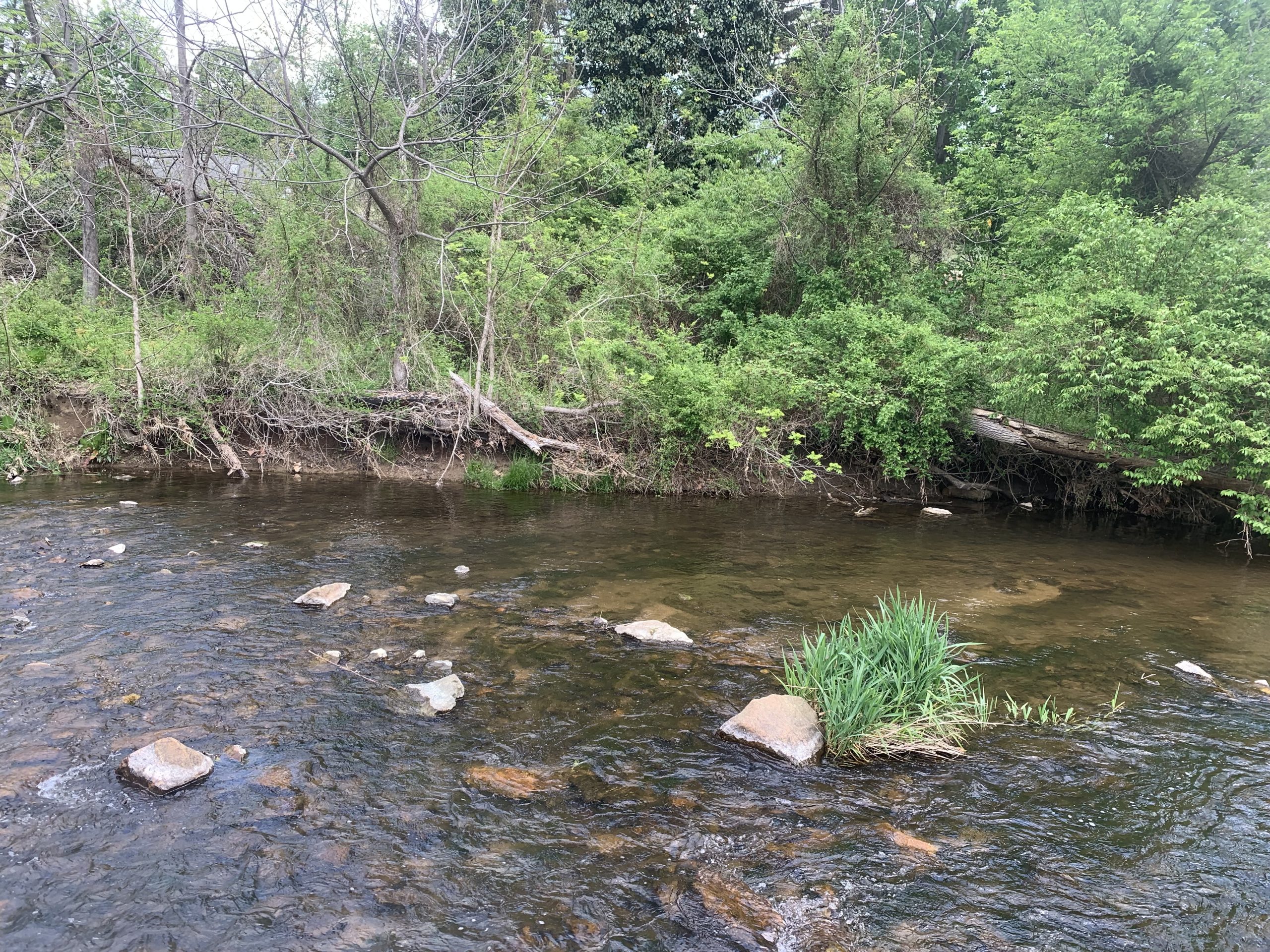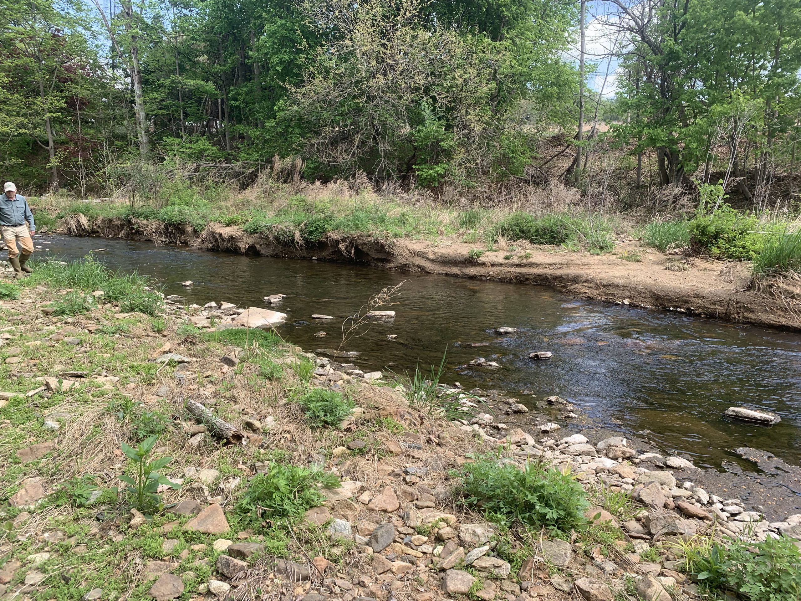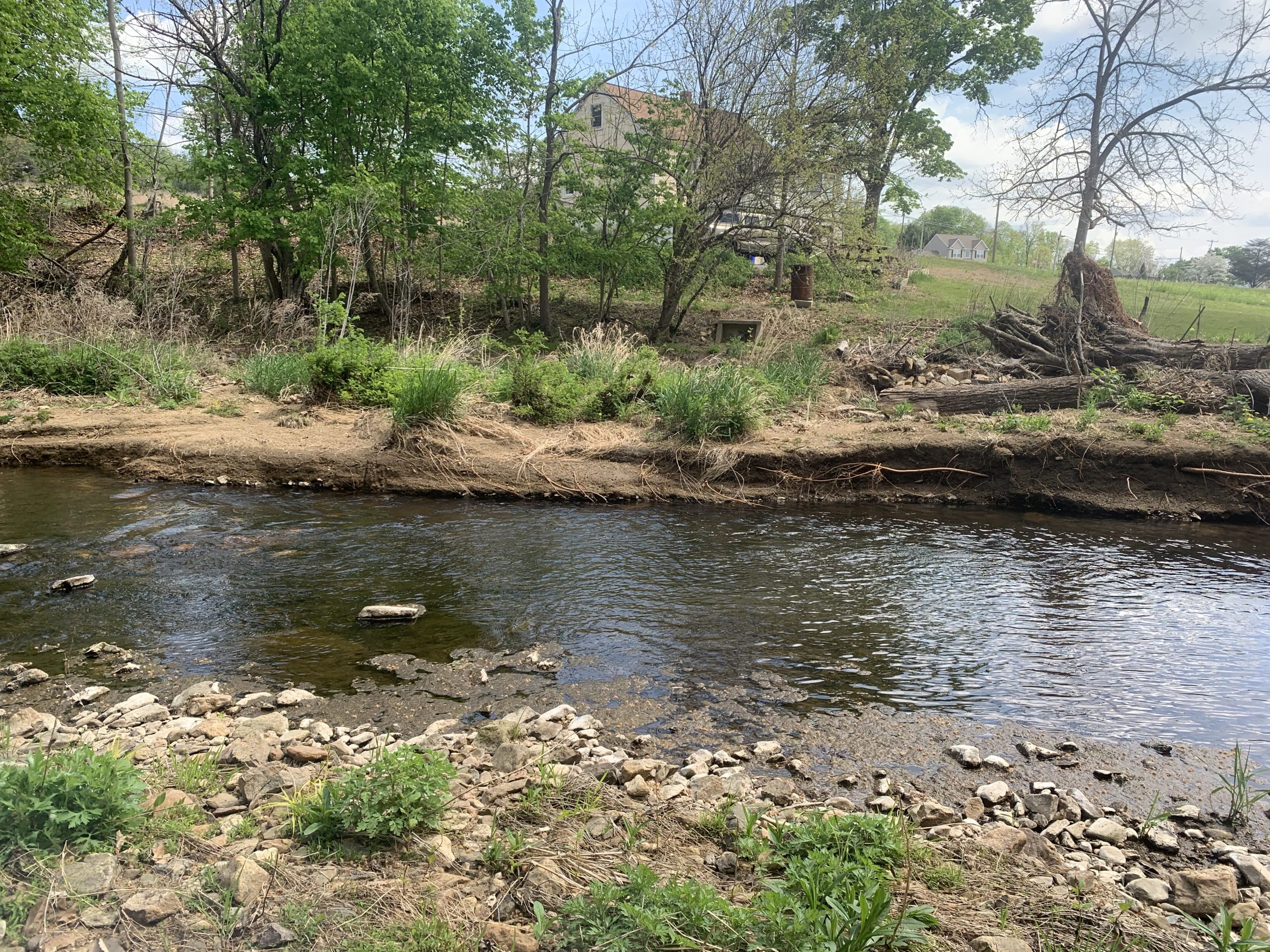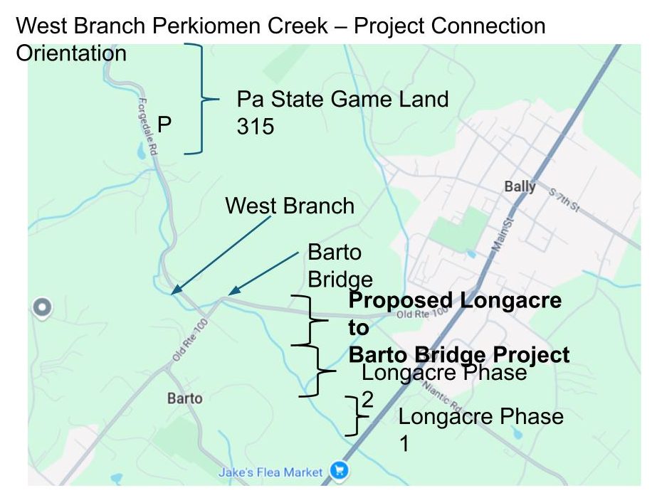Stream bank stabilization, erosion remediation, and habitat improvements on 1100-foot section of West Branch Perkiomen Creek upstream of the Longacre Farm, along two residential properties and a public utility, to the Barto Bridge. Environmental improvements include stabilization and remediation of multiple eroding and collapsing vertical stream banks, channel flow improvements, fish and macroinvertebrate habitat improvements, and riparian buffer improvement. This effort will include a variety of modified mud sills, multi-log vanes, toe logs, in-stream placement of random boulders, and riparian improvements including live-stakes and native shrub plantings.  This project will extend the prior WB restoration work another ¼ mile upstream.