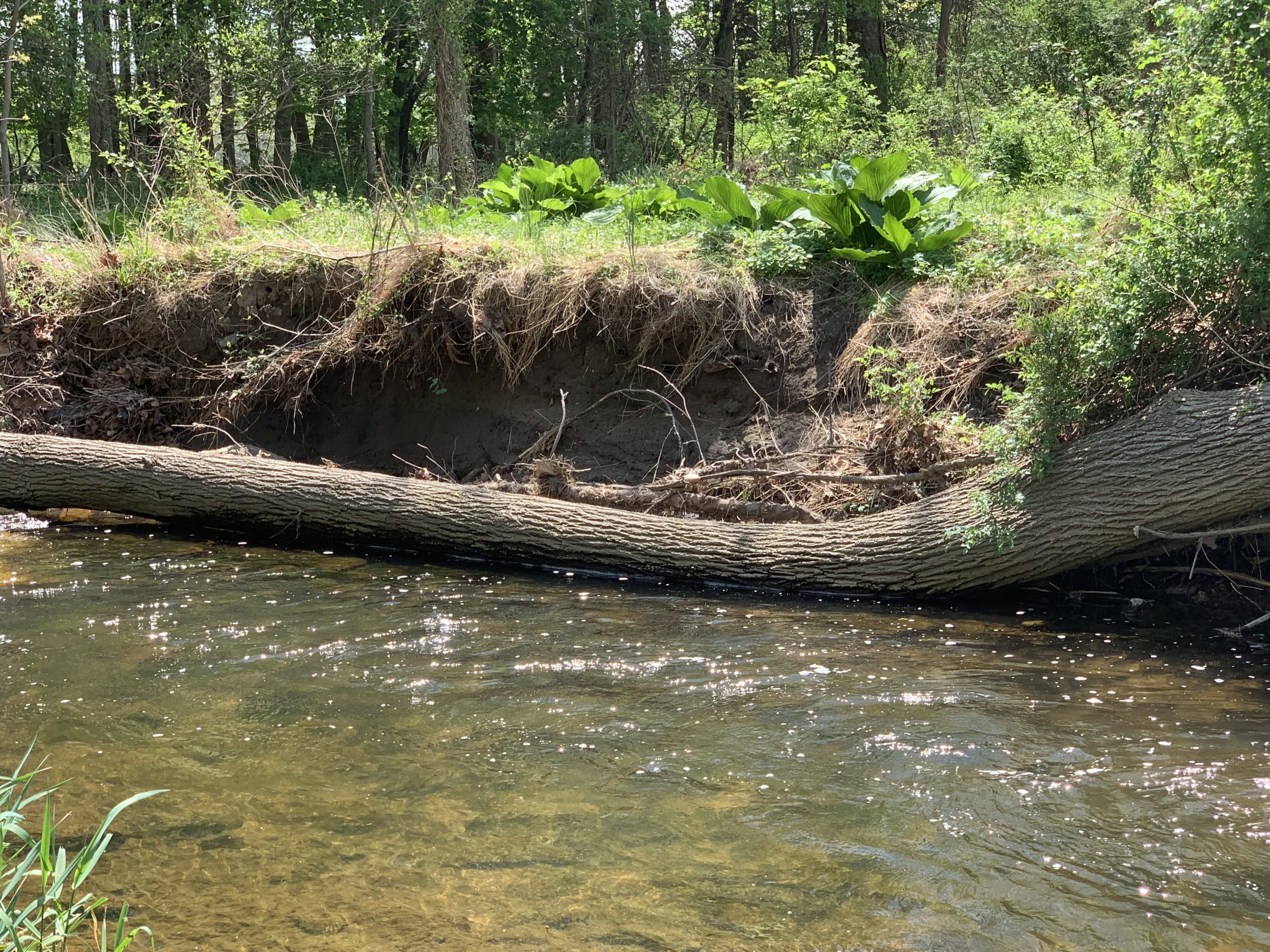 In these headwaters, historic agricultural use has caused instability and excessive erosion of stream banks in the creek, contributing to excess sedimentation, a lack of deep pool habitats, and increased nutrient loading in the stream. In addition, loss of riparian buffer due to utility easements and pasturing has reduced shade cover enhancing temperature impacts in the summer.